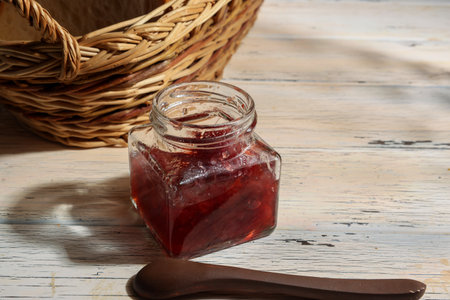Homemade strawberry jam in a glass jar with a label on a wooden table