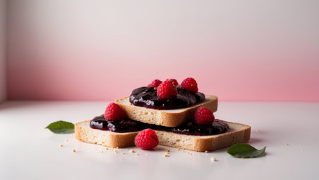 AI Generated. Three slices of bread with jam and raspberries on a pink background featuring raspberries
