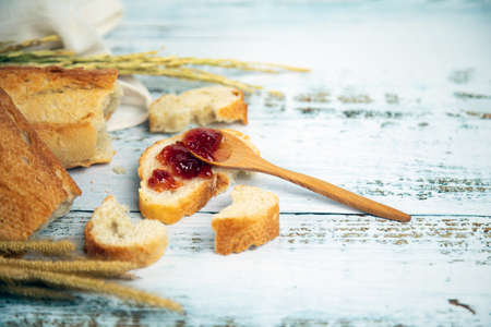 Close-up shot of sliced baguette with strawberry jam on white wooden board with ear of rice