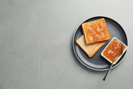 Glass jar of homemade carrot jam with toast on concrete neutral background. Image with copy space, selective focus