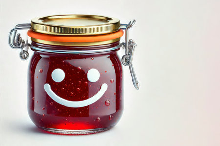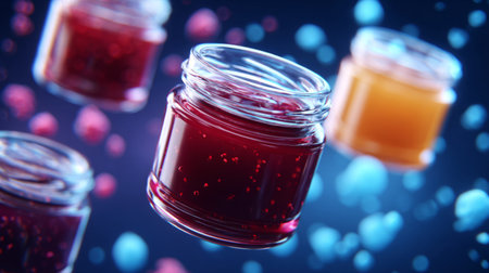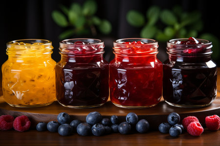 close-up of colorful fruit preserves in glass jars, created with generative ai