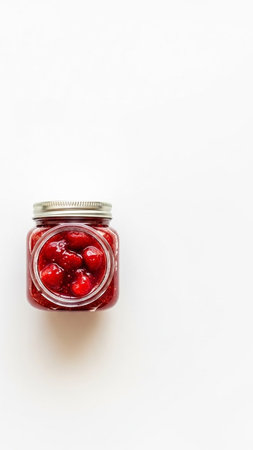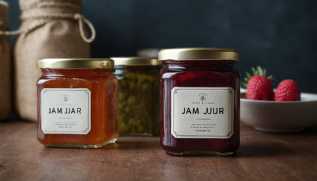 Home Preserves. A trio of jars filled with a delightful array of homemade jams: strawberry, apricot, blackcurrant, raspberry, peach, or cherry. Sweet, flavorful, and nutritious organic desserts. With ample copy space
