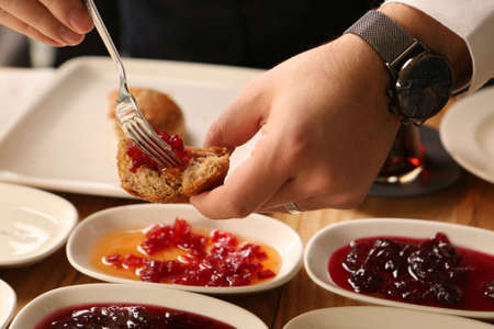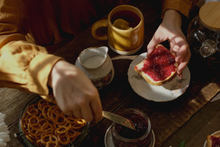 Morning breakfast. Woman preparing sandwich with berry jam. Cozy rustic lifestyle.