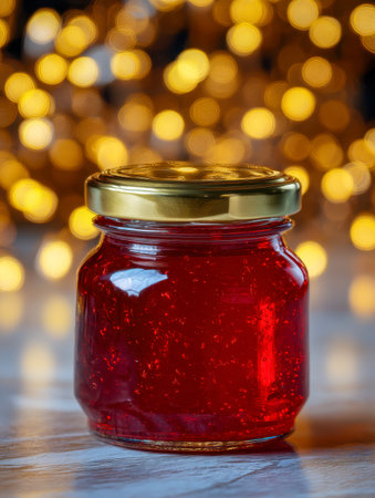 A sparkling jar of ruby-red jelly topped with a shiny gold lid rests on a rustic wooden table, illuminated by soft, festive bokeh glow.