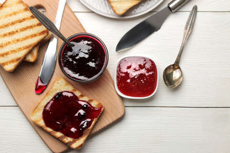 toasts with jam. fried crispy toasts with red jam on a white wooden table. breakfast. top view