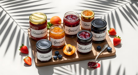 An assortment of glass jars filled with various fruit jams, including strawberry, apricot, and blueberry, arranged on a wooden board. Fresh fruits and dappled sunlight shadows add a rustic and artisanal touch to the composition.