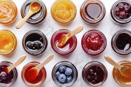 Assorted colorful jams in glass jars with wooden spoons on marble table.