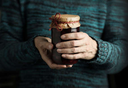 A senior woman holding a jar of homemade jam in her hands. Banner. Copy space