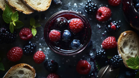 A vibrant arrangement of fresh berries and jam in a glass, complemented by slices of bread, ideal for breakfast or dessert settings.