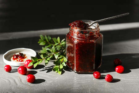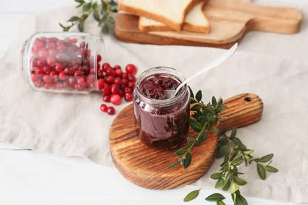 Jar with tasty lingonberry jam and fresh berries on white wooden background