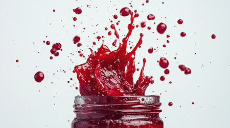 This image shows a dynamic splash of vibrant red liquid emerging from a glass jar, set against a clean white background, creating a refreshing visual impact.