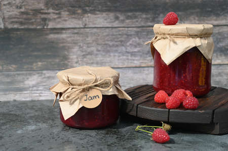 Homemade raspberry jam or marmalade in the glass jar and ripe raspberry on the wooden table