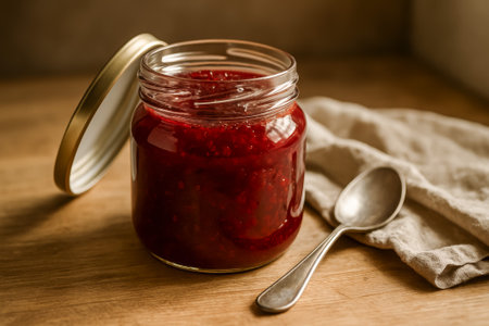 A jar of raspberry jam beside a silver spoon on a wooden countertop