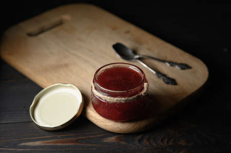 homemade strawberry pits. dessert made of must and flour placed inside small jars. Homemade raspberry jam ready for storage. jar filled with homemade apricot jam