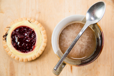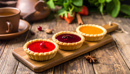Plate of assorted fresh jam tarts on a wooden table with a cup of white coffee