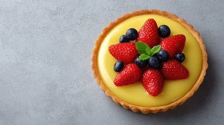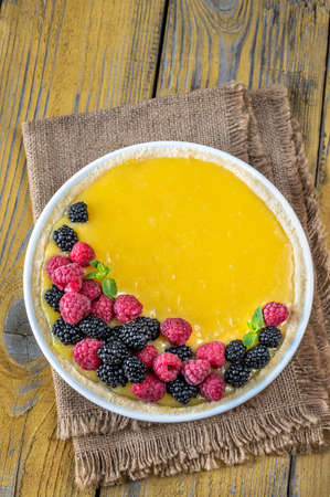 Lemon curd tart with fresh berries: top view