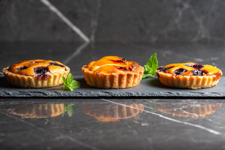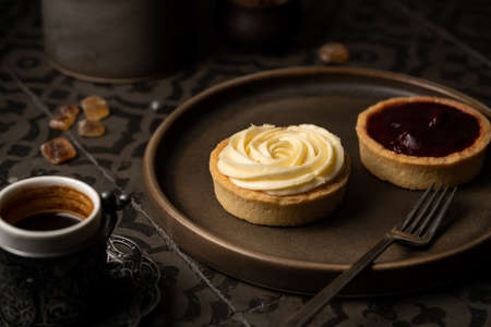Mini tart with whipped cream and lemon sweet dessert on dark tile background