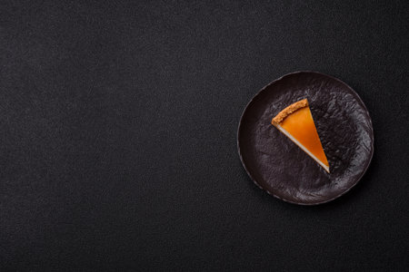 Delicious piece of American pumpkin pie in an overhead view.