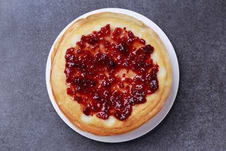 sweet pancakes with jam on a white plate