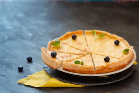 Blueberry tart on a dark background. Blueberry cupcake on black serving board with scattered berries