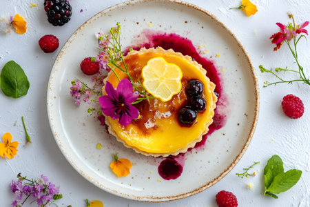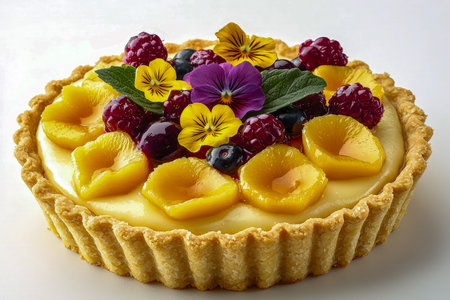 A vibrant, handcrafted pastry topped with fresh berries, edible blooms, and a flaky golden crust, exuding elegance and inviting indulgence.