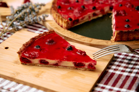 A tempting berry tart slice sits on a wooden board, surrounded by checkered cloth and a fork, featuring vibrant red filling with assorted berries and a golden crust.