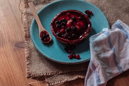 Berry pie on a saucer on a wooden table. Side view.