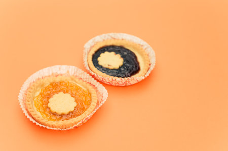 isolated apricot and cherry jam tart in a paper backing cup on orange background with text space