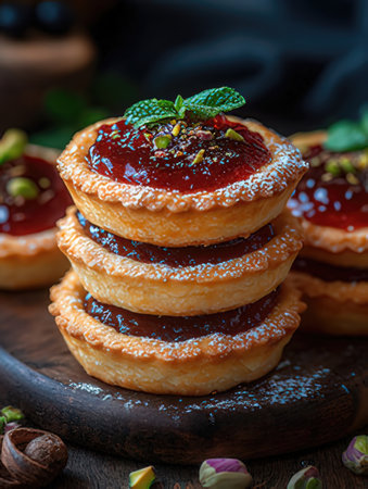 Tasty tartlets with jam and mint on a dark wooden background.