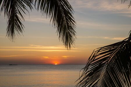 sunset over the sea in the tropics, the sun sinks into the sea, palm leaves in the foreground