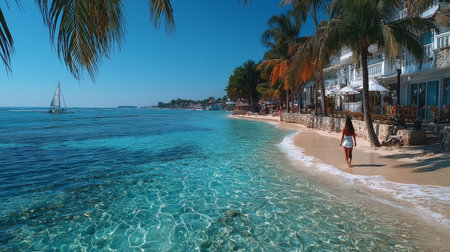 Sunny tropical beach with turquoise water, palm-lined coast, and a woman walking along the sandy shore.