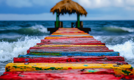 Colorful pier stretching into the ocean under a stormy sky with crashing waves and thatched roof.