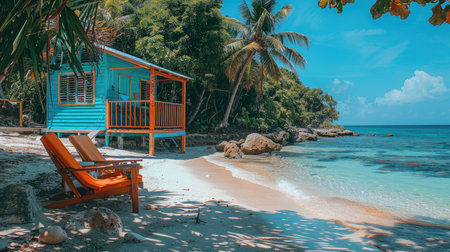 Tropical beach cabin with palm trees and clear turquoise waters