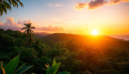 Serene sunset over lush tropical forest canopy