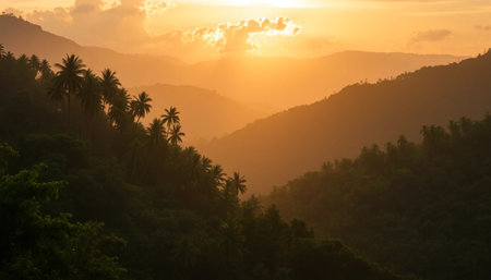 Soft evening glow over tropical jungle hills scenery