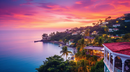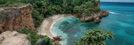 Tranquil and serene tropical beach paradise with secluded sandy beaches, lush greenery, and palm trees for a perfect vacation destination