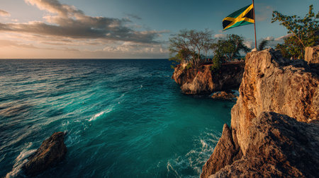 A scenic view of a Jamaican flag waving over a cliff-jumping spot, with turquoise waters below and warm sunset lighting, capturing an adventurous summer vibe.