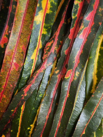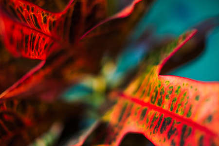 Vivid colorful abstract natural leaves texture background. Garden croton, fire croton, or variegated croton. Tropical evergreen for any plant background.