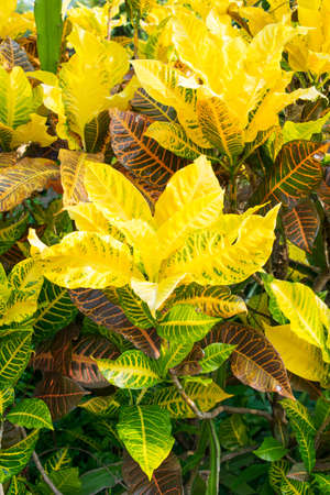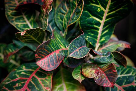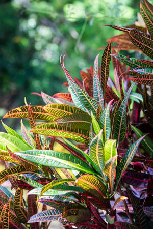 Colourful croton leaves in the garden, closeup.