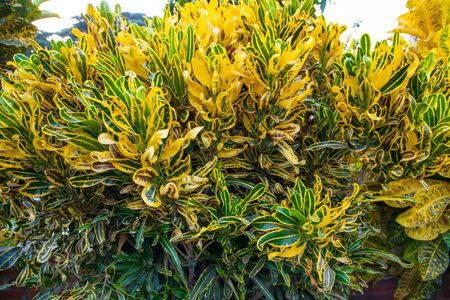 Long croton leaves closeup. Lush colorful foliage of yellow iceton croton