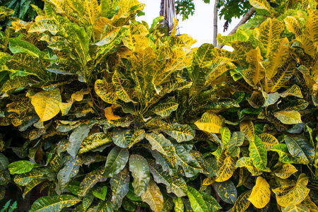 Close up of Codiaeum variegatum with large bright yellow leaves.Ornamental plants Garden Croton or Ariegated Croton, Croton variegatum L. An outstanding colorful, multicolor, shapes of leaves textures