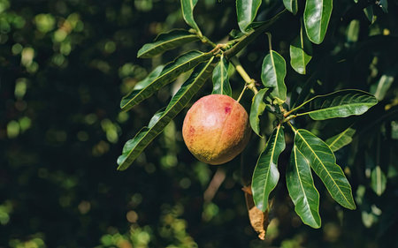 Unripe guava fruits on a tree in the orchard