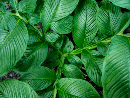 Abstract dark green of tropical plant and green leaf after rain drops in monsoon season