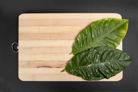 leaves onto wood plates on a black background
