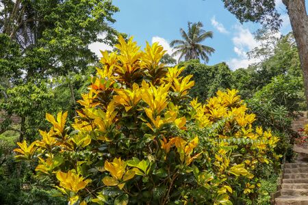 Colorful croton and lush tropical bushes landscaped in a garden.