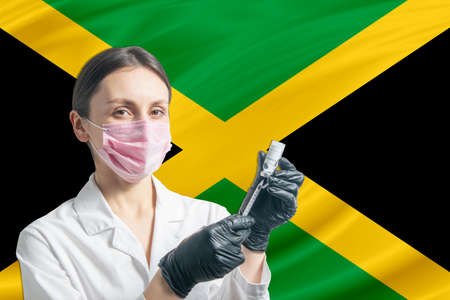 Girl doctor prepares vaccination against the background of the Jamaica flag. Vaccination concept Jamaica.