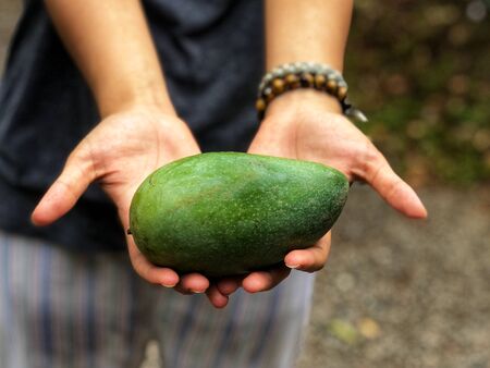 Fresh green mango (Bunbandan mango), hold by female hands.