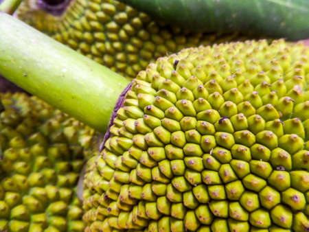 Group of fresh ripe jackfruit hanging on the tree harvest at orchard with nature bokeh background. It is a species of tree in the fig, mulberry, and breadfruit family. Selective focus on foreground.