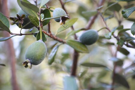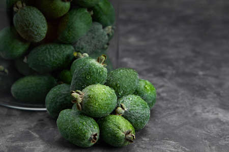 Feijoa whole on black background. Exotic fruit. Selective focus. Closeup.