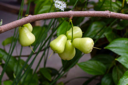 Young water apples fruits (Syzygium aqueum) on its tree, known as rose apples or watery rose apples